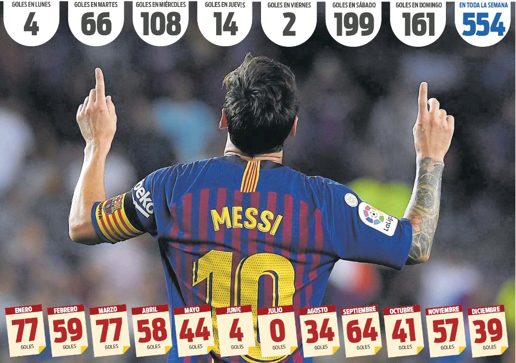 âڑ½ï¸ڈ الاسطورة ميسي على بعد هدف واحد من هدفه الـ 200، في المباريات التي لعبها مع البارسا في يوم السبت. 554 هدفا لميسي مع البارسا موزعة على أيام الاسبوع: â–«ï¸ڈإثنين 4 اهداف â–«ï¸ڈثلاثاء 66 هدفا â–«ï¸ڈأربعاء 108 هدفا â–«ï¸ڈخميس 14 هدفا â–«ï¸ڈجمعة 2 هدف â–«ï¸ڈسبت 199 هدفا â–«ï¸ڈأحد 161 هدفا |