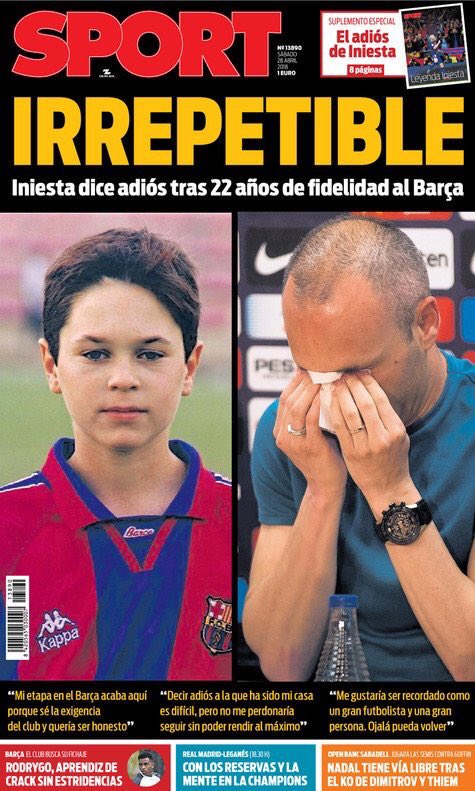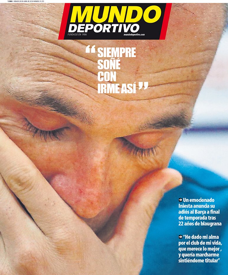 ![]() [ صحيفة الموندو ديبورتيفو + 28/04/2018 ] ![]() "حلمت دائما بالمغادرة هكذا" " أعلن انيستا رحيله من برشلونة نهاية الموسم بعد أن كان في البلوغرانا لمدة 22 عاما." "لقد أعطيت روحي لنادي حياتي, الذي يستحق كل ما هو افضل , وأردت أن أترك شعور وكأنها البداية." |